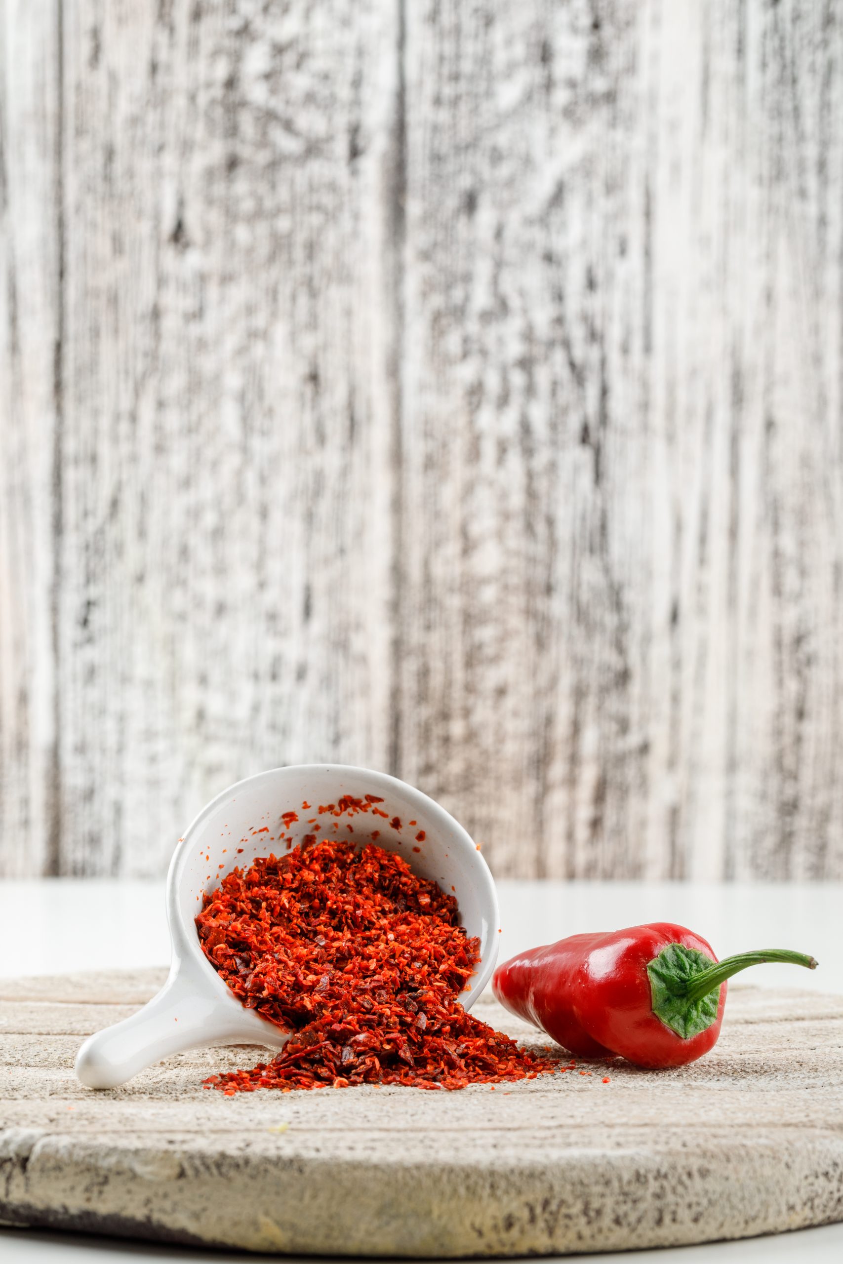 Chili powder with red pepper and wooden piece in a white scoop on white and wooden grunge background, side view.